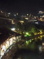 舞阳河北岸才是镇远古镇的古街,从新大桥到祝圣桥中间都非常热闹,中间还有几条古巷可以进去逛一圈,分布着好几个大宅子,这几个大宅似乎现在还是有人居住在里面的,这都是当时在镇远经商的大财主留下来的,可想当时的镇远富商云集,商铺林立。我们一路向新大桥的方向走,太阳已经落山,远处的云彩还依稀遗留着一点余晖,华灯初上,新大桥已经被灯光装扮的格外美丽,来到桥上,两边房子上的灯还是稀稀拉拉的,于是向当地的居民打听,得知,灯光开放是不定时的,有些开的早,有些开的晚。一看时间还有10分钟到8点,于是就决定再等一会,果然到了8点,很多房子上的灯光都亮了起来,整个舞阳河也好像活了起来,几条游览船在河道中穿梭,两岸的人