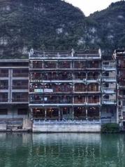 镇远古镇是不收取门票,我们的车可以直接开到晚上入住的客栈;这里的豆腐花味道是咸,而在广州的豆腐花以“甜”为主,吃不习惯;主街道出来牌坊后的街道像广州的上下九步行街,都是日常的商品店,原路返回牌坊的时候遇见了我们的团友,我终于又回到了队伍中。。。河岸上一排而过的杨柳,就像贺知章说的“碧玉妆成一树高,万条垂下绿丝绦”,杨柳下坐着一对夫妻,在专注看着相机;旁边还有垂钓的。有新桥走过去,就是南岸一条街;酒吧、餐馆、商品琳琅满目;晚上这边会非常的热闹当天色逐渐转暗,沿河两岸和街道两边灯火亮起;镇远古镇又华丽变身,今天是最舒适的一天,我们睡到自然醒,因为住的是靠近江边的房间,一拉开窗帘,一缕缕的阳光照进阳