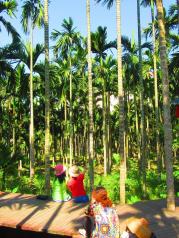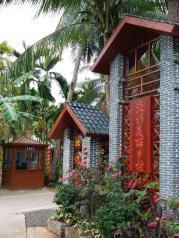 北仍村-主席夫人引领外国夫人们参观访问的乡村,肯定有不同凡响之处。它被国家农业部和国家旅游局分别授予:中国最美休闲乡村;中国乡村旅游模范村。村里面可以骑车游也可以步行逛。我们步行进村后20元坐电瓶车出村,因为村内是单行道,所以把整个村子转了个遍。很值得转个圈-原汁原味的海南风味乡村,乡村小道两旁大多数是笔直翠绿的槟榔树,另有橡胶树及其他不知名的大大小小的树木花草,称它为氧吧太切实不过了。村庄掩映在树林里面,几间小屋点缀在林间,也有重建的一排排砖瓦平房四合院,环境很好。进村要注意,树多虫子也多,我们坐在石凳石桌旁20分钟不到,手臂上、腿脚上咬了好几个苞,而且随着时间的推移越来越肿,痒的很厉害,当