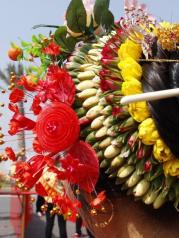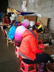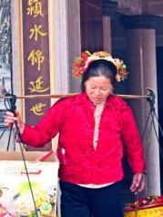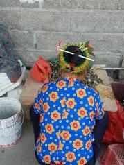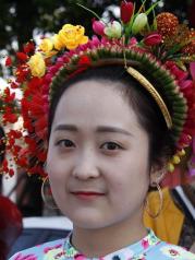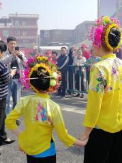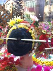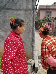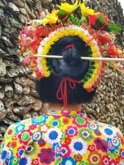 4月来到蟳埔村, 蟳埔女头饰文化 每个女人的头发都是在后面绾成髻,中间都插一根象牙色的筷子作发簪,或者再多插一根红筷子,圆髻的最外围,是漂亮的簪花围。有的还要再插上几枝配色鲜艳大胆的绢花。最简化的“版本”,也要在髻上绕一圈红头绳再插上绢花。