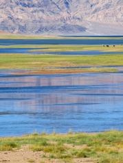 班公措湖湖水十分清澈,湖水由于光照、深浅、亮度等因素,呈现出墨绿、淡绿和深蓝等不同颜色。周边景色非常优美,四周群山环绕,远处雪山点点。