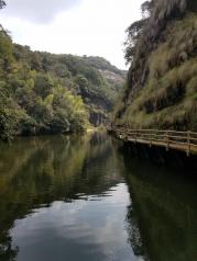 九龙潭门票包括门票、车票、竹筏票。景区还有一小段玻璃栈道,可是水汽太大,玻璃下边全是水滴,什么也看不出,当然也就没有收费了。九龙潭不错,值得一游,在里面流连了两个多小时,然后景区门口等车去上清溪,不用担心没车,工作人员会安排景区车送你的。