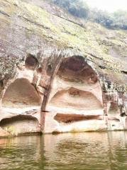 九龙潭景区,第二次来,风景非常好。丹霞地貌堪称江南最佳,坐着竹排在碧绿的潭水中缓缓游荡,两边是形状各异的石山,经历岁月的抚摸,留下种种痕迹,有的如龟兔赛跑,有的如情侣倚偎,有的像饱满的乳房,还有些伤佛重叠的箱子……