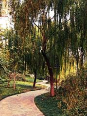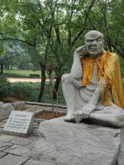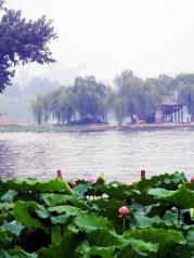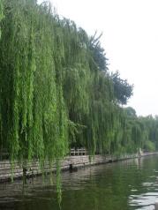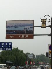 大明湖景区分成两个部分,北岸集中了不少楼台,定义为收费游览;南岸则以绿地为主,免费行走。这个西南门当然是附带收费功能的,趁着他们去给我买票,我先拍一张收费大门的嘴脸。 进了大门,我们是在西岸前行。向湖面望去,看到的是这样的景象。这是现代版的螳螂捕蝉,黄雀在后。我们转过脸就看见了阳光下的绿茵。“走小路,过小桥,村口一棵大榕树”这座桥很让人若有所思,不禁回头——再回首。