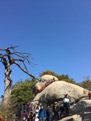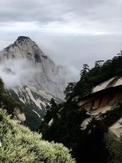 包车一日游,7点西安出发,大概8:30左右到华山景区,旅游团队的人很多。网络购票只能在景区门口兑换,山上不能兑换。去的当天在网络换票窗口被告知由于风大西索道关闭,西上北下的计划破灭,只能把西索道的套票退了,还好我是门票、北索道套票和西索道套票是分开订的。北峰方向的巴士排了半小时,巴士大概15-20分钟。巴士有两个选择:乘索道或是走智取华山步行登山路,我们选了前者,索道排了1小时,团队游客真心的多,等索道下来差不多11点多了,直接找亭子休息吃自带的干粮。吃完开启爬山模式。从北峰、中锋、东峰、南峰、西峰兜了一圈,中锋最没看头,鹞子翻身和长空栈道风大都没开,天梯和云梯蛮好玩的,都玩了一下,云梯更陡一