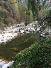 终南山范围好大,没有去景点,是沿着西安市往南有条进山的路,大约一小时,沿途有水流一直围绕公路左右,植被茂盛,周边都是各种饭店民宿吃住不愁,我们住的地方到秦岭分界点还有十几分钟车程,夏天很舒服。