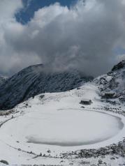 快11月份去的,去太白山国家森林公园准备物资:水杯,棉衣、雨衣、干粮、水果,鞋子最好死登山鞋。早上7::00西安北郊驱车去眉县汤峪,8:20到达,网上买的票,149/人,游客中心取票进站上车,进山是小中巴车,坐满发车,沿途在三个景区停靠,大概需要2个多小时到达天下索道,海拔2200m左右,因前方修路,小索道停运,要做索道只能从这上山,索道单程120,往返230,大概需要15分钟路程到达天圆地方,海拔3551m,山上云雾缭绕,山背面白雪皑皑,美若仙境。风较大,很冷,身上带的棉衣都穿上了,步行道小文公庙,到了中午饭点,大家都在开吃,吃完饭继续前行,这是就没有阳光大道了,一路乱石小道,路上有雪很滑,