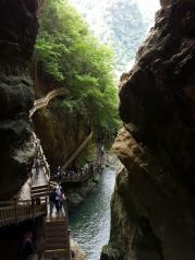 走在峡谷中间的天生桥驿道上,一边是山崖或溶洞,一边就是碧绿的湖水。洞中有瀑,瀑下有湖,湖上有“窗”,这种奇妙的高山喀斯特美景极富神秘性。风洞、峡谷、飞瀑、湍急的水流,可以深切感受到身临其境中自己身心的愉悦。高百米、宽数十米跨江而过的天生桥被誉为“大自然神力所塑造的东方凯旋门”。从几百米之外的远观,到一步步走近它时不同视角的欣赏,大自然的鬼斧神工实在是了得