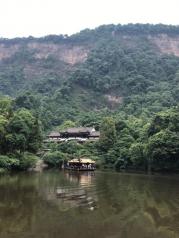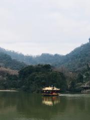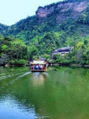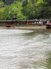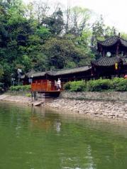 月城湖一片不是很大的湖,可以船游对岸,也可以走到对岸。在青山中不是很突显,但很静。青城山真的不愧是天然氧吧,绿植不是一般的多,进入景区大门后,上山前必经这里。游客们可以乘渡船(船票5元)到对岸,或走一旁的栈道绕行过去,不远