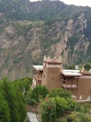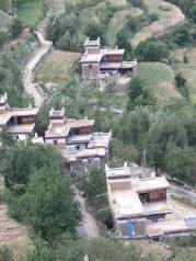 非常有特色的丹巴甲居藏族民居,建筑运用红白黑色,依山而建,配上蓝天白云,金黄的玉米,满树苹果梨子,非常美。对面有座高山,有房屋建在很高很高的山上,大家都很好奇怎么上下。如果能在里面住,就能好好欣赏室内的装饰,我们看到一户正在修的房子,真是雕梁画栋,太讲究了。不住的话只能在路上走走,看看外观。