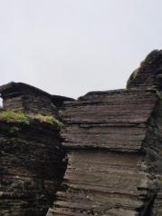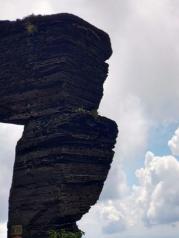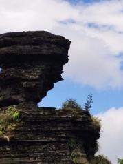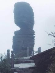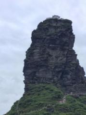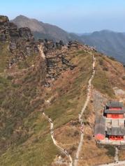 进入梵净山景区,停车场很大,先去游客中心自助取票。票上有接驳车排队号码,等了三个半小时,终于坐上接驳车。山里山弯里湾,到了索道站,缆车程十余分钟,尽情饱览梵净山脉的丛山峻岭苍翠绿植。开始步行登山,先往蘑菇石和老金顶方向。看到蘑菇石的刹那,不得不感叹大自然的造化之神奇!两块页岩石如此巧妙的上下组合,真的是鬼斧神工啊!一路登山看到的尽是页岩石,仿佛是网红蛋糕巧克力千层。继续前往老金顶,有一段山路较险峻,只容一人通过,两边是陡峭的山石还滴着水,台阶都被磨的精光。登上老金顶,海拔2494米,有个燃灯殿,正所谓“无限风光在险峰”,站在老金顶,看脚下群山连绵,云雾缭绕就在身边穿梭,看对面红云金顶若隐若现,
