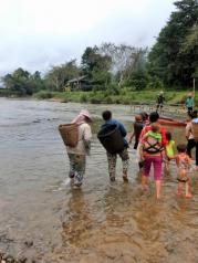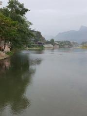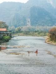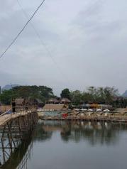 南松河,老挝‘废都’万荣的精华所在。民众过河靠东南亚特色的竹桥,机动车则可从镇内唯一的钢索简易桥过江,费用一个来回程两万基普。