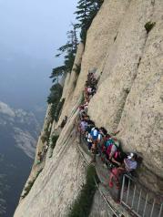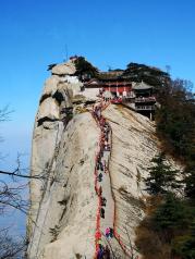 华山是中国古代的西岳神山,也是中国最为险峻的山之一。它位于陕西省渭南市华阴市,位于西安的东边。一般游客前往西安旅游,华山都是必去的一站。从西安去华山交通很便利,高铁、火车、汽车都有。汽车是最为便捷的,可以一直开到华山脚下的售票处,全程2小时。游客游华山有两种,一种是晚上爬山第二天早上看日出,然后下山。这种春夏比较适合,华山是24小时售票,路边都有路灯,但自己最好是准备个手电。这个季节夜爬的人很多,不用担心安全。冬天不推荐夜爬,有时雪下的很大,路面结冰,尤其走险道,十分危险。而且夜晚的华山也很冷,山风呼啸地吹,让人难受。另一种是早上6:30开始爬,一定要吃早饭,哪怕是泡面!备好干粮热水,速度快的