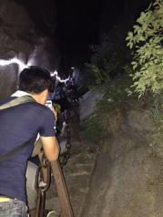 华山,被誉为天下第一险,心中一直神往,终于有机会到华山。当然是用最被推荐的游玩攻略,晚上爬山,第二天看日出。当天到了华山脚下,先入住一家酒店,早早就吃了晚饭,去商店买一些牛肉,压缩饼干,水等食物,回到酒店休息。因为爬华山很费体力的,需要充分的睡眠。定了闹钟,凌晨12点。 时间到,醒来,背起背包开始上山,路上认识一个人,单独出来游玩的,哈哈,我也是自己一人,正好结伴,路上也不会孤单的。 进了大门开始爬山,路上人逐渐多起来。刚开始还可以肩并肩一起走,到后来越来越陡,道路只能容纳一个人了。 越往上走,越难走,有些路段要手脚并用才能艰难的往上爬,惊吓