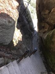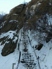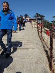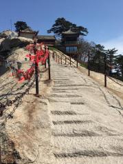 华山古称花山,其形状如盛开的鲜花一般,共有五座山峰组成,分别是北峰、中峰、东峰、西峰和南峰,就像五朵花瓣。其中海拔最高是南峰,海拔2160米。华山索道的另一头是北峰,海拔1600余米,是华山五峰中海拔最低的山峰,七分钟后抵达索道终点。一看,还不是北峰顶,沿着台阶再爬吧!山上石阶窄小且陡,山下望去绝壁千里,唯一依靠的是抓紧铁链。