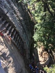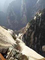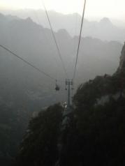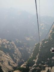 华山之险峻,这回算是真正体验到了。即使选择了最轻松的西上西下的路线,但也足以让我们惊心动魄了一回。我爬过的山也不少,缆车也不是头一回坐,但华山的西峰索道是我目前乘坐过时间最长、最让人胆战惊心,当然也是价格最贵的。从山底直接把你送到海拔2082米的西峰最高点,中途越过n座小山峰和2座大山峰,所以索道的抛物线就呈现出一个大大的m型。坐在缆车里面,你的心就会随着这抛物线跌宕起伏,缆车外面就是万丈深渊,比看大盘走势都来的刺激和惊险。好不容易经过这漫长的18分钟到达山顶,不料大雨来袭,我们大手牵小手龟速走过长空栈道,即使有伞,也都淋了个落汤鸡一样。华山之险,我们体验的是险上加险。谁知,返回山下时,下面晴