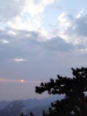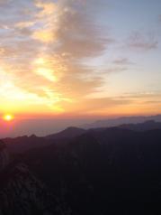 我们徒步上华山北峰、第二天又从‘自古华山一条路’那儿徒步下华山,天气晴好,运气也格外好。傍晚5点多时到达东峰峰顶看到了落日、佛光,只是数码相机拍不出来佛光的美景,只能凑合看了,老公说回去就换个单反︿_︿。晚上住在东峰饭店,饭店条件比预料中要好,被子很干爽,热水足够,洗漱水也可以,虽然水流小小的。以为山顶的饭一定贵得吓人,结果去看下,还行,56元一大盘的烧茄子,15元一大碗米饭,两个人吃饱,足够了,后悔背了那么多吃的东西,累死我了。水一定要带够,不然山越高水越贵,不过,还好,贵点没关系,有得卖就好啊! 第二天早上还幸运地看到了日出,太阳未出来的时候天空很美,山上早上天气很冷,我们把能