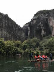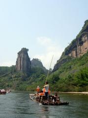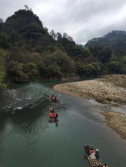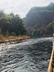 去武夷山坐九曲溪漂流还是不错的,一个半小时的行程领略武夷山景区风景比爬山要舒服多了。唯一的缺点就是有点冷!去九曲溪漂流,可以在武夷山乘6路公交车,也可以打的到星村码头排队登笩。 小小竹筏随波逐流而下,从九曲到一曲,溪面忽而平缓似池,忽而湍急如潮,你随之亦然,穿行在山水画廊中有惊无险。 全程要1个半小时左右,可以饱览武夷山风景的三十六峰碧水丹山。