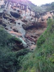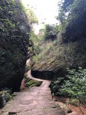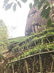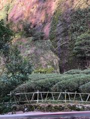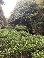 大红袍景区是武夷山必游景点之一。我想它大概是和龙井十八棵御茶一样的存在。 下了景交车,还需要走好一段路,爬好一段台阶。这段路上有一些茶园,种的武夷岩茶的品种有肉桂、水仙等等。 上台阶的山路旁有涓涓的小溪流,时不时的因为落差造出个小瀑布来。 一直往上走到有小卖部休息厅的地方,就看得到大红袍母树了。传说它们长在悬崖峭壁上,其实也没那么夸张。 这六棵大红袍母树已经有360多年的历史,作为古树名木列入世界自然与文化遗产。 这母树产的茶叶尤其珍贵,曾经拍卖出天价。不过现在国家已经禁止采摘了。还有专业的技术人员负责养护这六棵树。 这个景点,重在感受武夷山的茶文化,景色很一般。