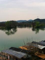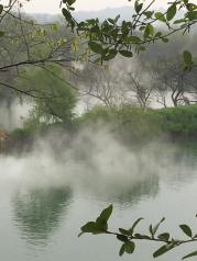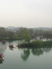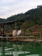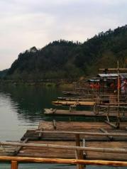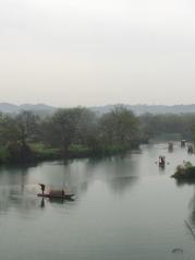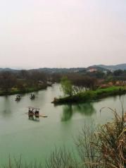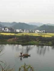 江西月亮湾的河流至此刚好一个孤形拐弯,河中间有个类似的岛,象弯弯的月亮,故而得名月亮湾。游客到此,都会慕名下车停留,看看它的好景色。我们到时,下午突降阵雨,本想在这儿看太阳西下时的美景,泡汤了,可惜!这儿,坐木筏船,包船150元/条,半小时,人多划算。天气不好,讨价后2人,100元/条,却未划到半小时,果真一分钱一分货。岸上公路边有很多村民卖土特产的,生意还好,我们也买了些皇菊。