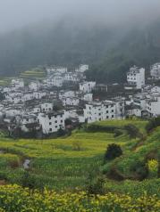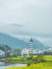4月春雨,婺源的青山间飘起浓浓的雾气,宛若仙境。而田间的古塔和黑白色房屋的色彩与周围的自然环境十分和谐。身临其境,享受大自然