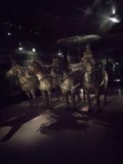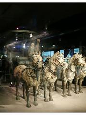 兵马俑】陕西临潼兵马俑揭开了秦始皇盛极一时的面纱。 秦陵一号铜马车,摆放在展厅入口巨大的玻璃罩内,周围环境昏暗,灯照在马车上,马车的轮廓清晰可见,车前驾四匹铜马,车舆内竖立着一个高杠铜伞,伞下有一立姿御官俑,车上配有铜弩、铜盾、铜箭镞等兵器。《后汉书·舆服志》刘昭注引徐广曰:“立乘日高车,坐乘日安车。”可见一号车应该是秦始皇乘舆中的立车,又名高车,是我国考古史上截至目前出土的体型最大、结构最复杂、系驾关系最完整古代车马,被誉为“青铜之冠”。