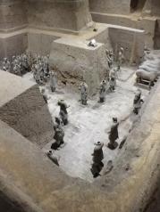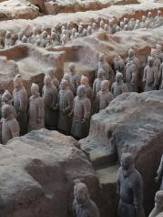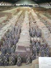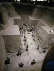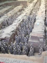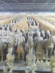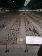 兵马俑在西安临潼区,几经修整,现在景区的面积和周边环境比十年前发生了天壤之别。景区外面的广场规划的很整齐,景区里面的树木已经很茂盛,在夏天的遮阳性还不错。女贞树的花发出淡淡的香气。 兵马俑分一,二,三个馆, 据说景区还有四号馆的预留位置,地下的状况也一探明。 一号馆:坑道中的兵马俑以车兵为主体,车、步兵成“矩形”联合编队。军队有的穿战袍,有的着铠甲,武士中间配有战车,每辆战车后有驭手一名,车士两名。一号坑复原的兵马俑大概有一千多。 二号馆(不确认是二还是三):展有铜车马共两乘,出土时已碎裂。是从秦始皇陵转移过来的。 经考古人员复原,比例为真实车马的二分之一,铜车马一号车,名“立车”,车上立一