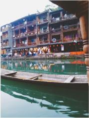 凤凰古城山不高而秀雅,有众多古色古香的石板街道。乘坐乌篷船,在沱江上游行,别有滋味。江水不深而清冽,从古城墙下蜿蜒而过,两岸是飞檐粉壁、吊脚楼,犹如浓墨浅彩的山水画。
