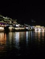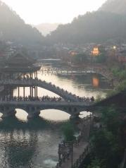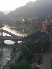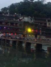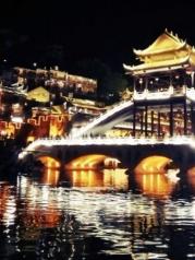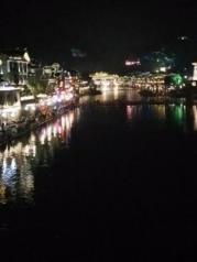 与丽江古城不同的是,这里有一条宽阔碧绿的沱江,成为古城内最大最引人流连的风景。 沿南边街直走到东门城楼,向左或向右都可以穿到江边;沱江两岸分布了密密麻麻的酒吧和客栈,到了傍晚灯火辉煌,歌声鼎沸;沱江上横跨许多风格复古的大桥,秀丽多姿,以虹桥为界,上游依次分布了雪桥,凤凰一桥,凤凰二桥,雨桥……,下游依次有风桥、雾桥、云桥、……中间夹杂着一些不知名的简陋木桥。