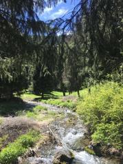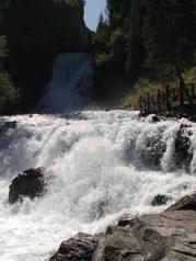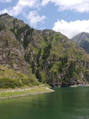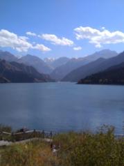 天山天池真的好美,远处峰峦层叠,天空蔚蓝明亮,池水一碧如洗,果然不负盛名,传闻这就是王母娘娘洗澡的瑶池仙境。西小天池是山上一条瀑布流成的小溪汇成的,远处有窄窄的小峡谷,池水碧绿如镜,凉风一吹,波光鳞鳞,如果此时有一叶扁舟从小峡谷里飘然驶来,那真是诗情画意,无法言表了。怪不得他们都说这儿有点桂林山水的味道。