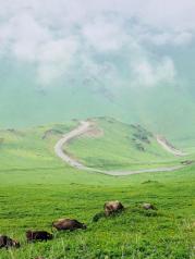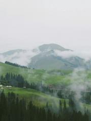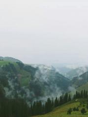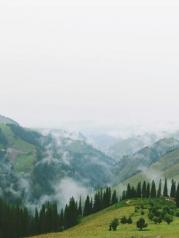 从独山子到库车的公路简称独库公路。是新疆最险的公路,同时也是一条英雄之路,曾有168名烈士为修建这条公路而牺牲。不过虽然之前看到有不少人对独库的景色赞叹不已,但我想毕竟只是一条公路,景色无非就是绿树青山而已。且我们从喀拉峻奔往巴音布鲁克的那天,天气不好,正当下雨,更不期待会有什么大美景色。可当独库我真正出现在我眼前时,才发现我想错了。虽然没有阳光普照,但雨中的独库却别有一番风味。满山青草嫩绿如茵,高大的树木挺拔苍翠,几个小小的白色毡房点缀其间。山间雨雾氤氲缥缈,如梦如幻,美不胜收。从巴音布鲁克到乌鲁木齐时,依然要经过独库。早上雾气浓重,遮住了前行的路。还好中午天空开始放晴。而且发现独库的景观远