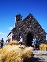 新西兰好牧羊人教堂,到了好牧羊人教堂,这里算是比较著名的景点,人稍微多了一点,不过和中国比起来,真的已经算人很少了!这个独特的教堂坐落于新西兰南岛特卡波湖岸边,背景是辽阔的山水风景和巍峨的高山,风景如画。