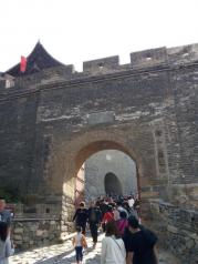 雁门关——一进门就收了停车费5元并主动给了发票,景区内的停车场不小,9点到的时候还有很多空位,景区门口左侧还有个很大的应急停车场,等我们中午逛完回的时候,都停满了。停好车后在游客服务中心可以买门票和小交通票,小交通单程5元往返10元,车程:游客中心-明月楼(不想坐小交通可以走到明月楼,大约2公里),门票60岁以上免票,网上团购价和现场买价格一样都是77元,提前网上买好可凭二维码直接到明月楼检票口扫码验票,60岁以上老人也是直接拿身份证在检票口刷身份证就行,很方便。进入景区,走过吃饭住宿一条街后,先是边贸街,里面全是卖土特产的,从边贸街穿过或者走边贸街左边的路就到了城墙脚下,穿过城楼大门进去后就