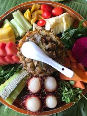 野象谷看完大象后,去体验野象谷的象餐! 以大桌为主,好多团队来用餐,没有发现散客! 一个大果盘,搭配7种左右小菜!吃饭过程中有服务员来回加菜,加饮料! 饭菜质量怎么说呢,还行,能吃!!这里的餐分两种!素餐和肉餐!素餐是50元,肉餐貌似80,多一些烤肉啥的!我们吃的素餐!还不错!