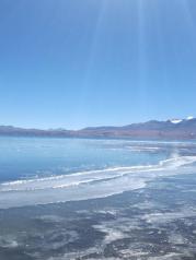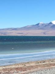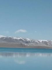 玛旁雍措是西藏三大圣湖之一。与羊卓雍措和纳木措相比,玛旁雍措地处偏远的阿里,声名不显,游人知道的较少。 西藏大大小小的湖泊上千个,被称为圣湖也就三个。玛旁雍措是藏民心中真正的圣湖,湖的周边座落着各教各派的八座寺庙,每年还有不少信徒转湖。 我去的时候是公历11月份,正是西藏的旅游淡季。圣湖虽然被围了起来,但没有人守着,我们没有购买门票,轻而易举就翻过围挡,到达湖边。 湖的西南角矗立海拔7600多米拉木那尼峰,湖的西北方向则是著名的冈仁波齐神山。 远远望去湖水是极深的宝蓝色,走近观看则呈现出深蓝、亮蓝、浅蓝、淡绿等不同的色彩,和多庆措类似。 这个季节,高原天气很冷,风也很大,湖边的石头上结了厚厚的