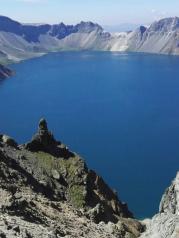 长白山天池是一座休眠火山,火山口积水成湖,夏融池水比天好蓝;冬冻冰面雪一样洁白,被16座山峰环绕,仅仅在天裕峰和龙门峰之间有一狭道池水溢出,飞泻成长白瀑布,是松花江的正源。 天池像一块瑰丽的碧玉镶嵌在雄伟的长白山群峰中,是中国最大的火山湖,也是世界上最深的高山湖泊。天池海拔2189米,略呈椭圆形,平均水深204米,最深处达373米。天池水温0.7度—11度,年平均气温7.3度,现为中朝两国的界湖。