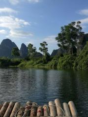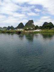 遇龙河是漓江在阳朔境内,最长的一条支流,有“小漓江”之称,风景非常秀美,遇龙河的竹筏漂流很有名,我们的行程安排,两人一筏,有船夫撑篙,一路船行,天公作美,前两天的阴雨全无,白云天上飘,两案远近的山头,像极了泼墨画,我和同行吴姐,聊聊家常,看著沿河秀美的山水田园,真是惬意啊~