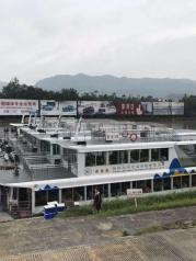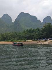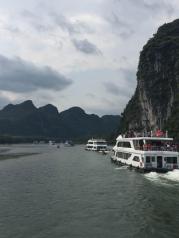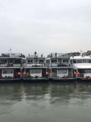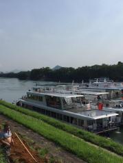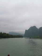 去兴坪漓江买了305元单送码头和船票的团购。早上6:50就被大巴从酒店接出来,一路停了7个酒店接人,8:15才开始往码头开,一路上导游推荐游船升舱(50元/位)罗汉果和桂花香水。大巴车一直开的很慢一路30码的速度,终于在9:10到了码头。最早的一班船是10点出发,9:30可以登船。上船后,又有摄影师推荐相册,15张照片做成相册150元。服务是挺好的,船上也很干净。来桂林的几天每天下雷阵雨,今天10:00正好遇到下大雨,漓江水很浑浊。中午的航空餐味道一般,只能吃饱。还有卖小吃冷碟的20元/份。13:15船就到阳朔了。