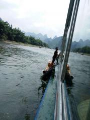 兴坪漓江风景特别好,去了才知道真的是甲天下,不过导游说游船本来买的票都在一层,看风景拍照视野不好,说让我们升舱,每位50元,两个人100元,我半信半疑的就花了100元,也不知道是不是真的需要这个费用,后来上船之后觉得很值得,二楼坐的很舒服,位置在船头,走出门就可以游览漓江风光,不错,不错,不过今天最让我兴奋的是坐船中途下雨了,在雨中的漓江山水真的很漂亮,一些游客都很高兴,总之一句话漓江美,烟雨中的漓江更美!
