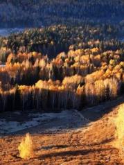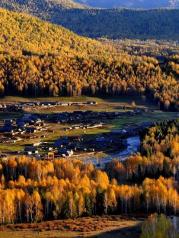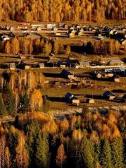 禾木风景区位于阿尔泰山脉中麓,这里保存着最自然、最原始的山野风光,风景独美,禾木河自东北向西南流淌,原始落村与大草原和谐自然的融为一体。这里也是古老的蒙古族图瓦人的居住地。 村庄中的民居都是原木搭建的,满山遍野的杉树,黄色、铁红色中的炊烟缭绕的小木屋,让久居都市的人们,忘却回家的路。