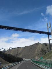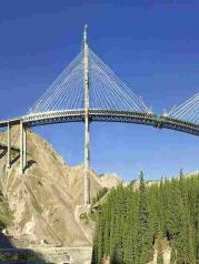 果子沟大桥全称果子沟双塔双索面钢桁梁斜拉桥,该桥地上部分建设于07年8月22日开始浇筑。果子沟大桥是国道045线赛里木湖至果子沟口高速公路建设项目控制性工程之一,桥梁全长700米,桥面距谷底净高达200米,主塔高度分别为209米和215.5米,大桥主桥全部采用钢桁梁结构,使用国内特殊专用桥梁钢材17000吨,并采用高强螺栓连接,安装精度控制在两毫米以内。