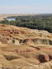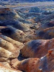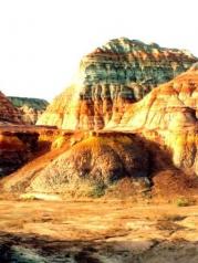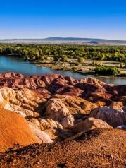 从禾木村出来,路过布尔津县,顺道去看离县城不远处的五彩滩,上帝打翻的调色盘,一般的雅丹地貌周围都是戈壁荒漠,但五彩滩却无比奇妙地衬托着对岸的绿色河谷。截然不同的地貌一河隔两岸,俨然两重天,对比强烈又浑然天成,形成参差不齐的轮廓,色泽各异,五彩缤纷。这就是大自然的造化,这就是布尔津额尔齐斯河的五彩滩!这是在额尔齐斯河河边裸露的彩色谷地,规模不是很大,但颜色很丰富。顺便说一下,网上看到的五彩滩甚至七彩张掖照片,绝大多数做了后期加色,鲜艳得不真实。我在拍照时,特地作了对比,真实的五彩滩就是这个样子。
