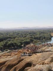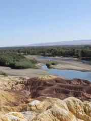 五彩滩风景区前还有大型的风力发电网站,给辽阔的视野里添加了一曲动感活力的生命旋律。绿草如茵、山花烂漫、牛养成群、骏马奔驰,绿洲与沙漠之间穿插着群群的骆驼,大场面的景观更体现哈萨克牧民纯情,朴实的牧民生活,让您感受到一路春风一路歌声。 北岸它是悬崖式的雅丹地貌,山势起伏、颜色多变,其是由激猛的流河侵蚀切割以及狂风侵蚀作用而共同形成。