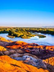 五彩滩位于新疆北端,属阿勒泰地区,布尔津县境内,地处我国唯一注入北冰洋的额尔齐斯河北岸的一二级阶地上,海拔480米,是前往喀纳斯湖景区的必经之路。兼有火(日出日落)、土(雅丹地貌)、金(巨型风车)、水(碧蓝河流)、木(河谷秋林)之美。