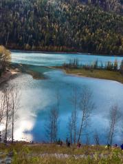 卧龙湾是喀纳斯河的一段河湾,位于著名的月亮湾和神仙湾的中间,也是水面最开阔的一段。因为河中一个小岛形似恐龙而得名,枯水期尤其明显。
