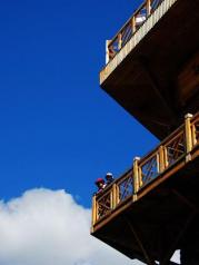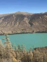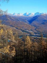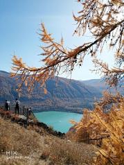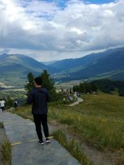 区间车去观鱼台,20多分钟的车程,路上看见远处雪山顶上皑皑的白雪,下了区间车要爬1068级的木质台阶,才能够到达观鱼亭,台阶不太陡,有好几处观景台,可以看到喀纳斯湖不同的角度。