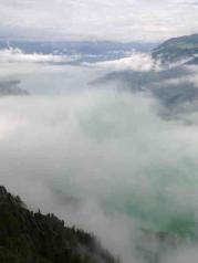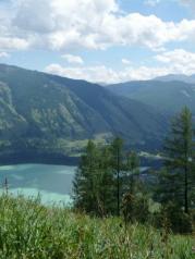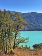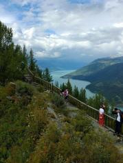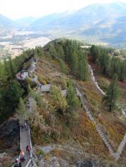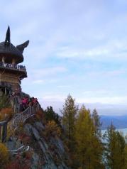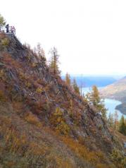 车到车站,还需要爬1068级台阶才可以到达观鱼台,这里海拔2300米和湖面有600米的落差视觉角度绝对一流,四分之三的湖面尽收眼底,可以从喀纳斯的三弯一直看到鸭泽湖。