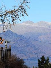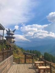 从游客中心坐小巴到观鱼台停车场只要几十分钟,可一路上坡的走路要1个多小时,我们在车上与4人打了照面,他们要走的路还挺长呢。观鱼亭的小巴往返车票60元,单程30元。要单独买票。一路上坡,车开的相当猛,坐在外侧的人必须要系安全带,否则随时会被甩出。 观鱼亭的字是余秋雨先生提名的。从停车场到观鱼亭顶一共有1068个台阶,在上坡的路上,左侧是百花园,现在一片碧绿的草地夏天最美,右侧就是天池上游三道湾,一步一景。登到亭顶,整个天池六道弯尽收眼底。