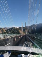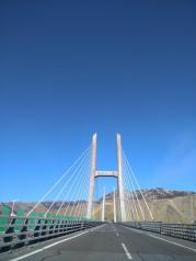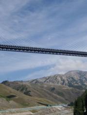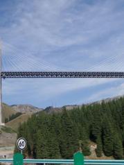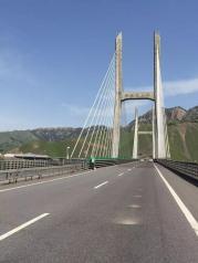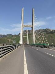 路过果子沟大桥,刚开始我们的车在大桥下面开,抬头就能看见那座斜拉钢丝绳的大桥,后来顺着公路就能绕到果子沟大桥上面去,大桥两边护栏很单薄。