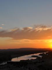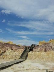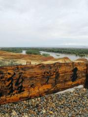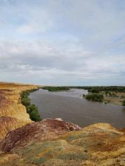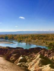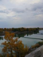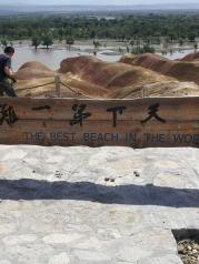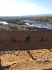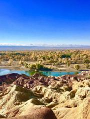 五彩滩这里的丘陵地质奇特,显示出多种色彩,每到傍晚夕阳照耀时,颜色绚烂奇幻,非常壮观。对岸是一片茂密的胡杨林,倒映在河水中景色优美